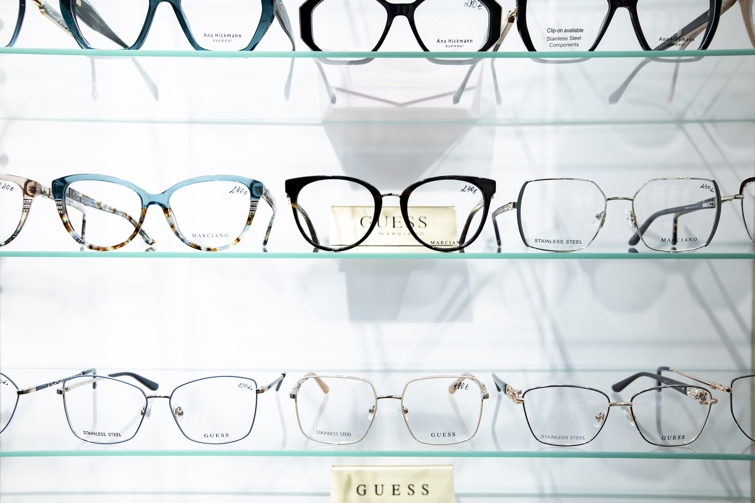 Guess, Hugo Boss, Jaguar, Bolon, Escada, Nina Ricci, Laura Biagiotti, Baldinini, Police, Furla, Tom Ford, Cogan, Harley Davidson, Carrera, Cavalli, Swarovski, Genny, Mochino, Puma, Paul Costelloe, Celine Dione jne.